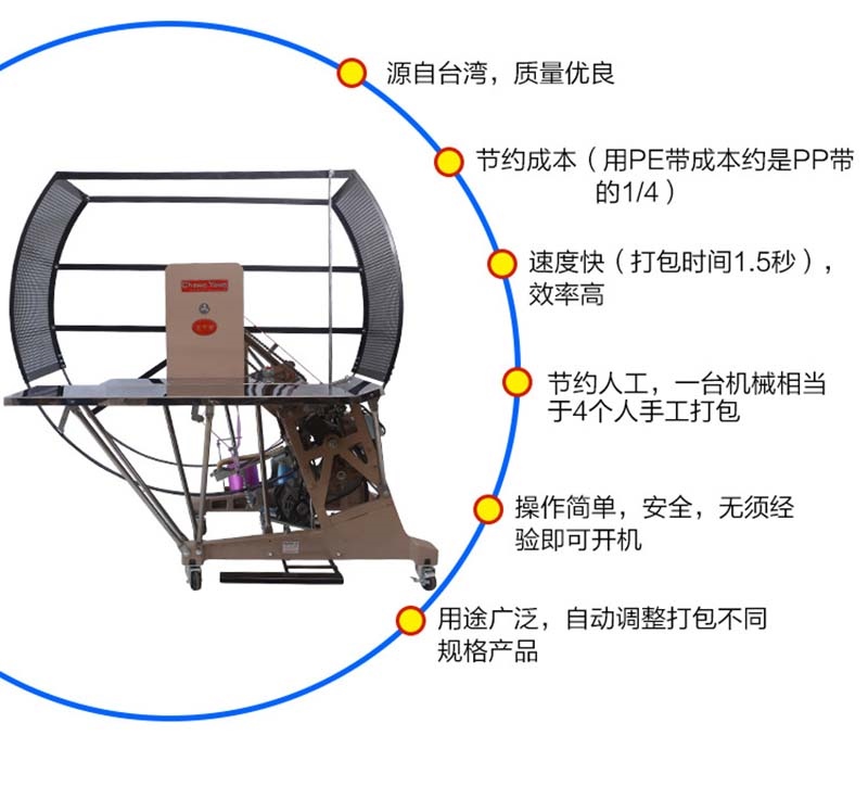 小機器大用途,使用本機可幫你減少人員工資支出(一臺機械相當于3-4人手工作),1.2秒可完成一個打結動作,加快工作流程,降低成本。此機使用PE環保透明軟繩對捆綁物品無污染、無損壞、捆綁出的物品整齊美觀,本機操作簡單、安全,無需經驗即可開機,用途廣泛,自動調整捆綁不同規格產品。